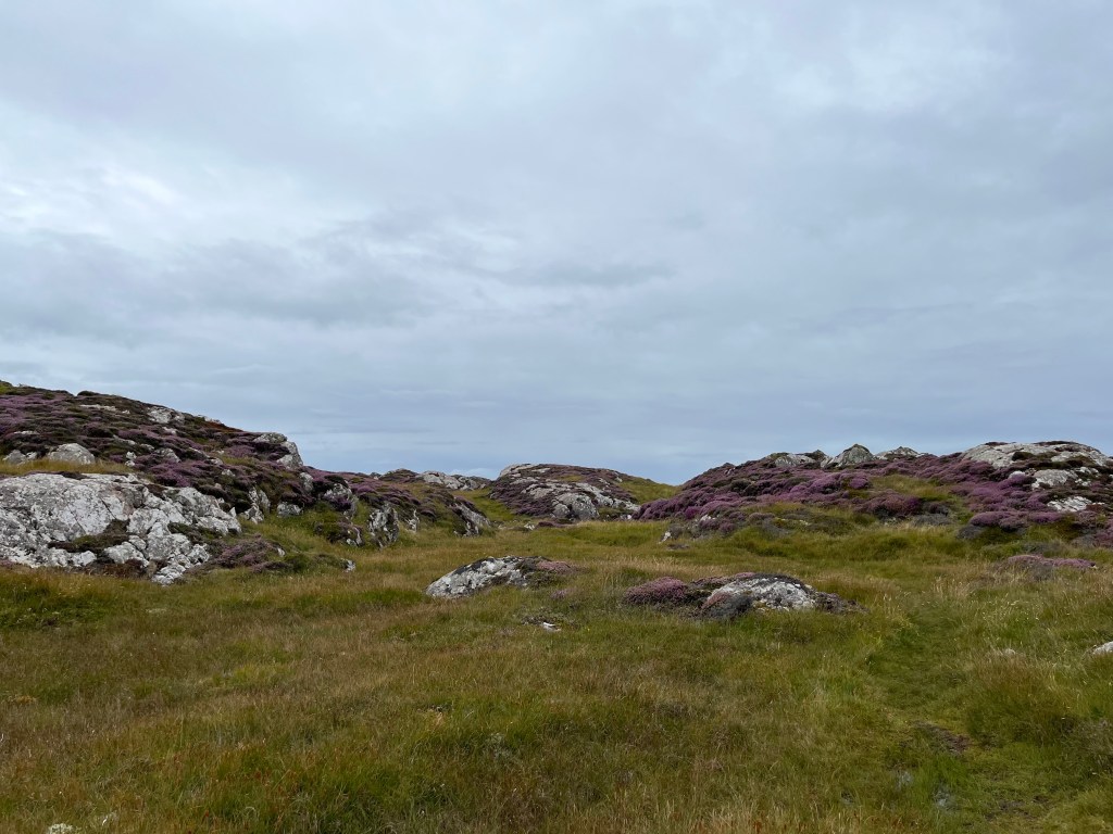 The ground became marshy. I could see the soil and vegetation turn from sandy golds and bright greens to deep browns. I crossed over a fence and made for one of the first peaks along the coast to reach higher ground. What I noticed as I climbed, and what is characteristic of Iona’s uplands, is the bright pinks and purples of the heather that cover its hills. This was the joy of following the northwest coast. With the heather came bumble bees, and their buzzing was the sound of success once another summit was reached.