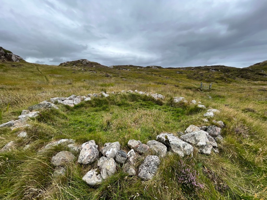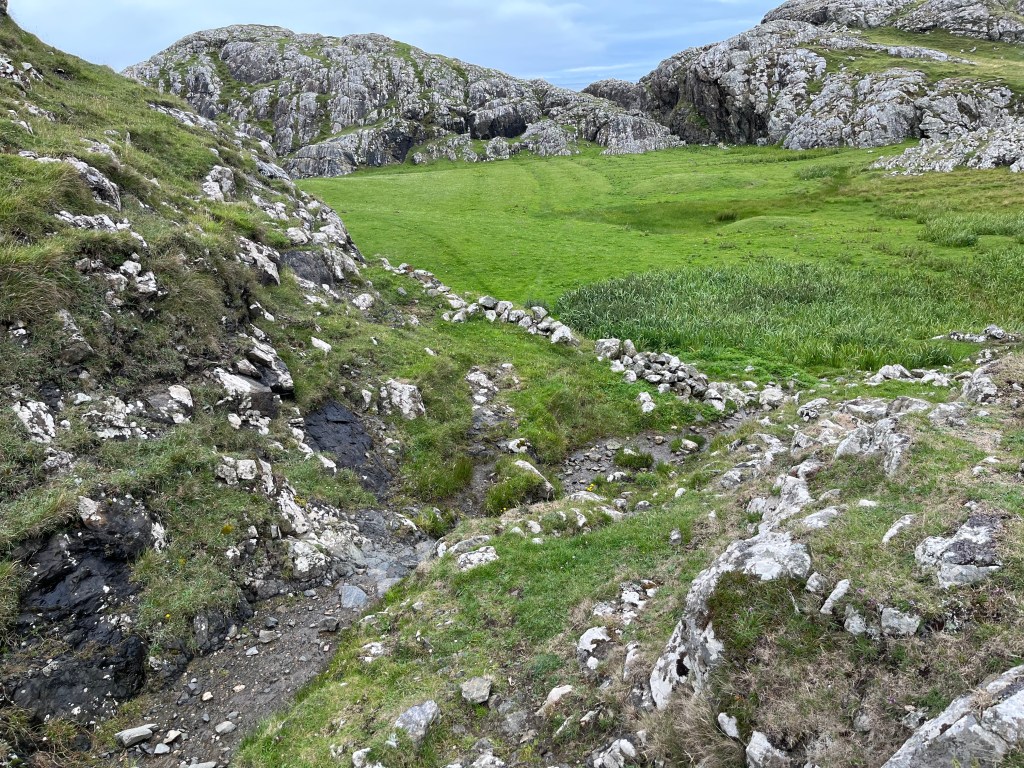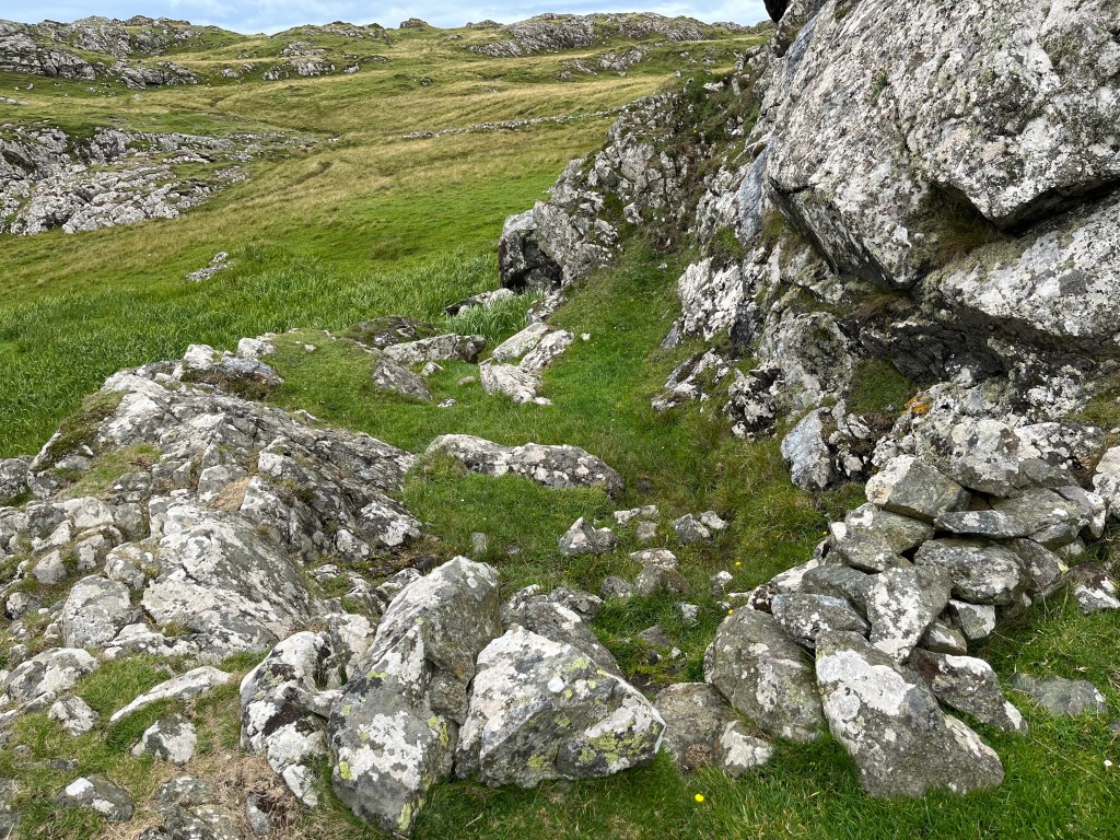After some more trudging in the interior of the island, I set my sights on Dùn Cùl Bhuirg, a large hill on the coast, host to an Iron Age Hill fort. Climbing the hill was a treat but searching for the fort was a slight disappointment: some stone walls are all that I could see remaining. Excavations were over five decades ago, and the diagrams on the excavation report were not a good guide to finding all the sites. Maybe I don’t have an archaeologist’s eye.