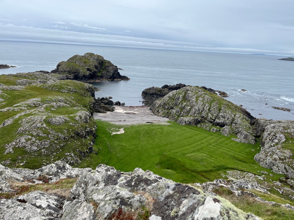 Active between the first and third century AD, the fort is our best understanding for life on the island before the arrival of St Columba and his monks. There is carbon dating and pollen evidence from the east coast that reveal some habitation pre-Columba too, but those are far less detailed pieces of evidence. Some say the fort had a subsistence economy that can be compared against the fully harnessed potential of the island by the early Christian monastery. I personally believe that Dùn Cùl Bhuirg is more likely to have been a seasonal or ritual feasting site. In part, my reasoning is informed by its location. What I found most interesting in the archaeological report, and now fortified after trudging through marsh to reach the hill’s eastern face, was that the site truly commanded the western shore of Iona. The main sightlines and paths below the fort all control the small bays along the coast. These were all visually fascinating, but the main place of habitation on Iona has always been on the east coast, away from the dominant westerly winds. Why build a fort on the west? I have thoughts on why this may have been, but need time to think more on it…