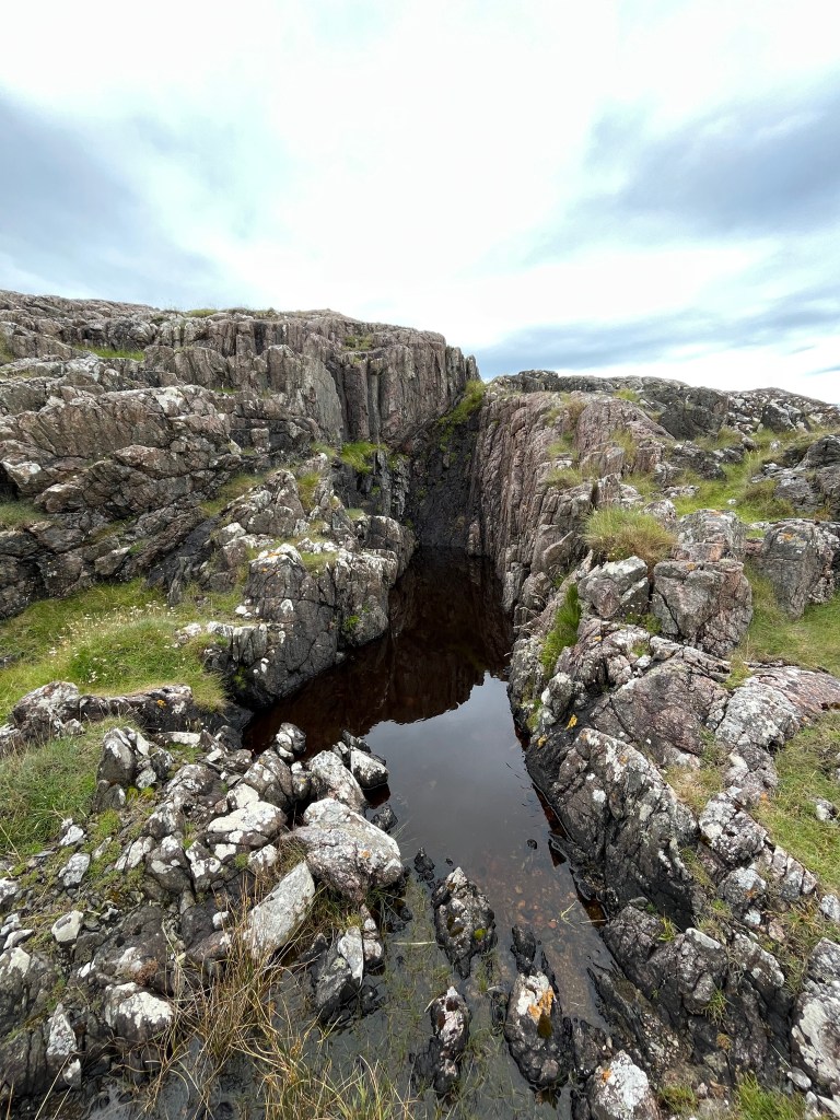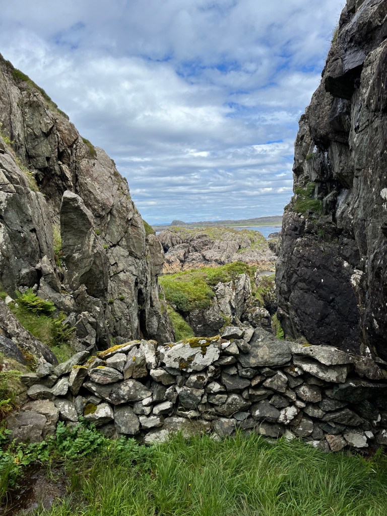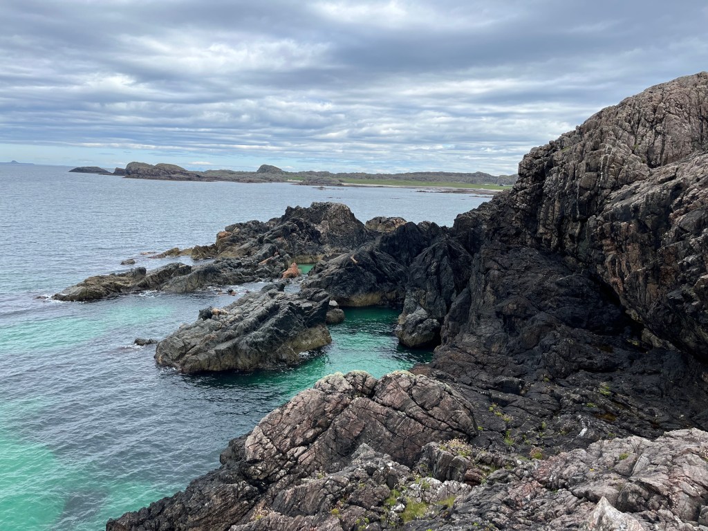 I started on the path to St Columba’s Bay. Past a few holes on the Iona golf course, the track turned into a short valley that came onto a small loch. I had heard in the pub the other day that only a few decades ago this tiny loch supplied much of the water to the island. Pub wisdom is like a historical source: to be eyed with suspicion but trusted on the whole. Instead of continuing on the path, I turned west to bring me close to the shore. Whereas the north coast, and even the northwestern coast, had bays, beaches and gentler slopes down to the shore, the southwest coast was sheer, with rocky promontories that jut out into the Atlantic. These appear as hazards on nautical charts, and are warned about by the admiralty pilots I have read.
