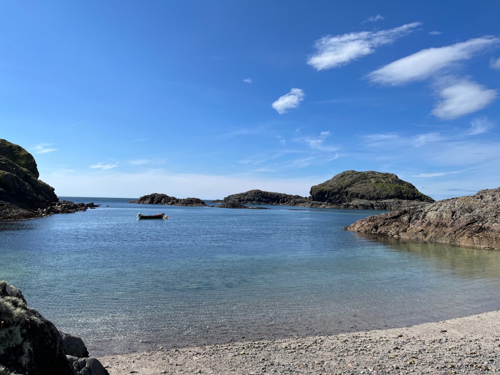 I eventually found my way down to another bay on the other side of the promontory, found a place to scale the steep hill (the sheep grazing on the side gave me some hint that it could be climbed), and I made my way up to one of the highest points on the south coast. After this, tired, I made my way back to camp, and had a celebratory swim afterwards in a little bay on the west by a little boat.